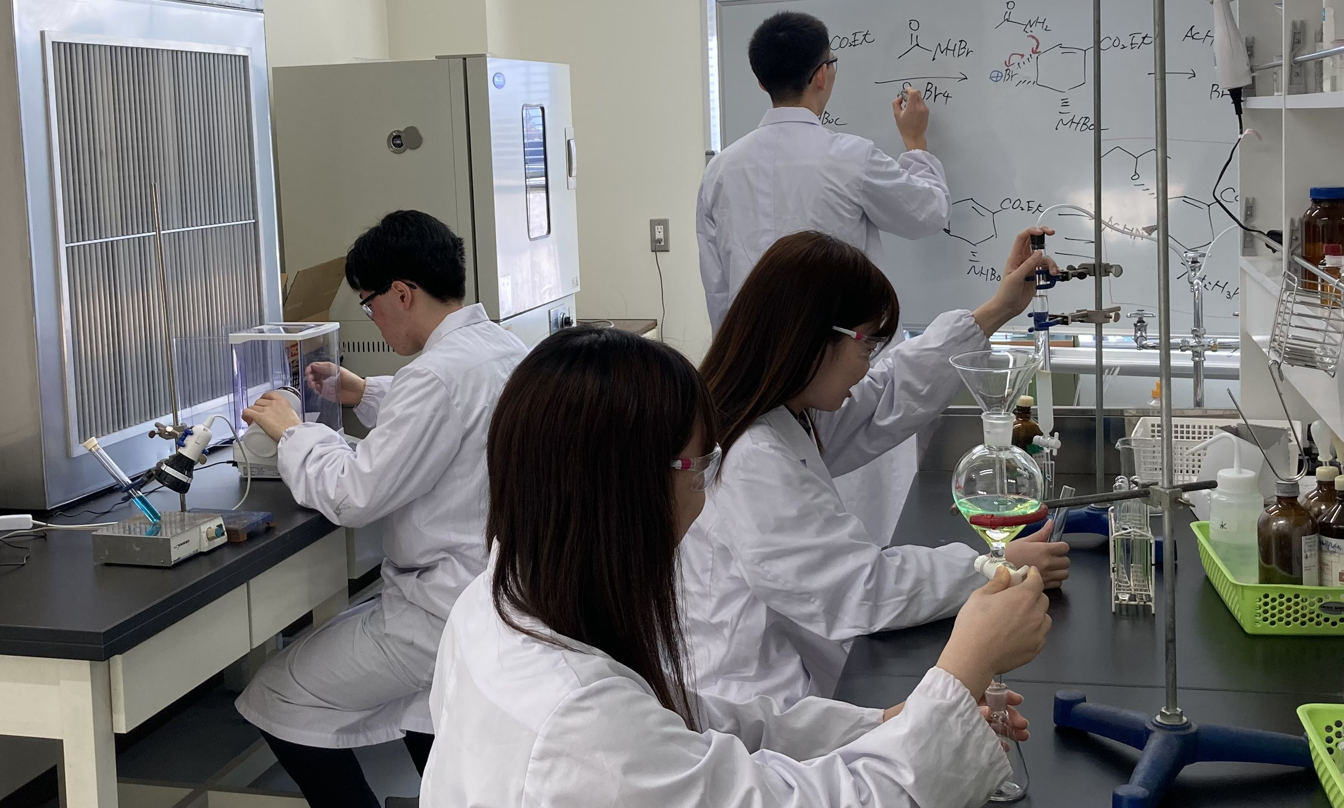 皆さんは有機化学が好きですか?私も昔は嫌いでしたけど、今では大好きです。なぜ嫌いだったか?それは、有機化学が何の役に立ち、それを使って未来を明るくできるビジョンが浮かばなかったからです。私は前職で医薬品の研究開発職をしていました。これは有機化学を学んでいたからこそできたお仕事で、有機化学のおかげで人の命を助けるという社会貢献することができました。そもそも有機化学は実験して初めてよく理解することができる分野です。勉強が苦手でも、手を動かして実験ができれば、あるとき突然、新たな反応が見つかるのです!!そのようなワクワクする経験を皆さんと一緒に体験できたら嬉しいです!。皆さんもきっと夢中になると思います。私の研究室は他の研究室より大変だと思います。でも、後悔はさせません。有機化学を通して、実験の仕方、論文の読み方、化学的な考え方を学び、卒業後に立派な研究者や技術者になってください。